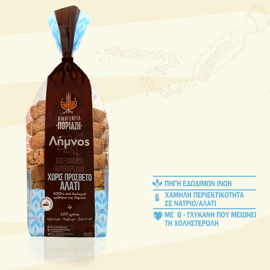 Τα Κριθαρένια Παξιμάδια Πετρομύλου χωρίς πρόσθετο αλάτι παρασκευάζονται με φυσικό προζύμι και το αλεύρι από τα ντόπια κριθάρια της τοπικής ποικιλίας “Παναγιά” που οι ίδιοι καλλιεργούμε. Δεν περιέχουν πρόσθετο αλάτι/νάτριο, καθιστώντας τα κατάλληλα για όσους προσέχουν τη διατροφή και τη υγεία τους.